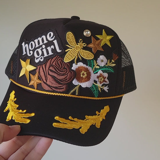 Because real estate isn’t just a career, it’s a whole persona. This handmade foam trucker celebrates the “Home Girl” who knows every neighborhood, every local spot, and every buyer who’s this close to writing the offer. Gold bee, floral vibes, star power, and that captain-style leaf embroidery? Yeah… this one runs the show.
