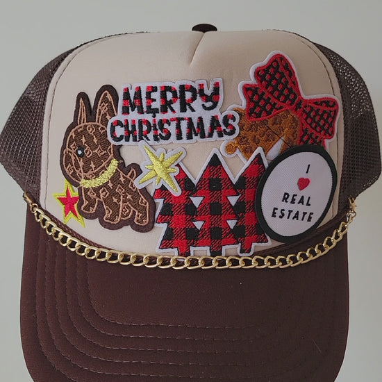 This handmade foam trucker hat brings the warm-and-fuzzy holiday vibe with a gingerbread-style puppy, plaid Christmas trees, a festive bow, and the classic I ❤️ Real Estate patch. The gold chain trim gives it that extra sparkle your December deserves.