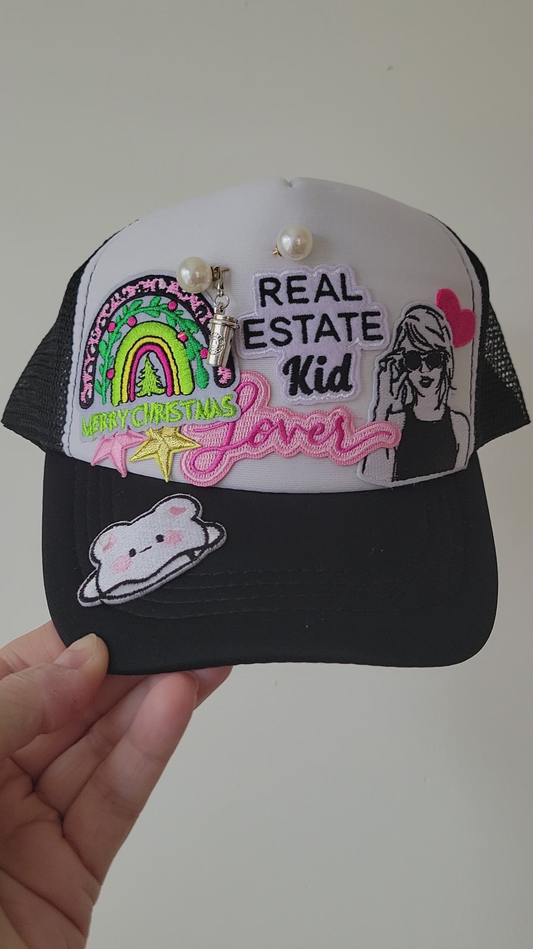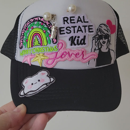 This limited edition kids’ foam trucker hat is stacked with personality — a Christmas rainbow, “Real Estate Kid” patch, neon “Lover” script, Taylor Swift-inspired patch, sparkly stars, a kawaii bear, and even a pearl + tiny drink charm. It’s bold, adorable, and totally one-of-a-kind… just like your little sidekick.